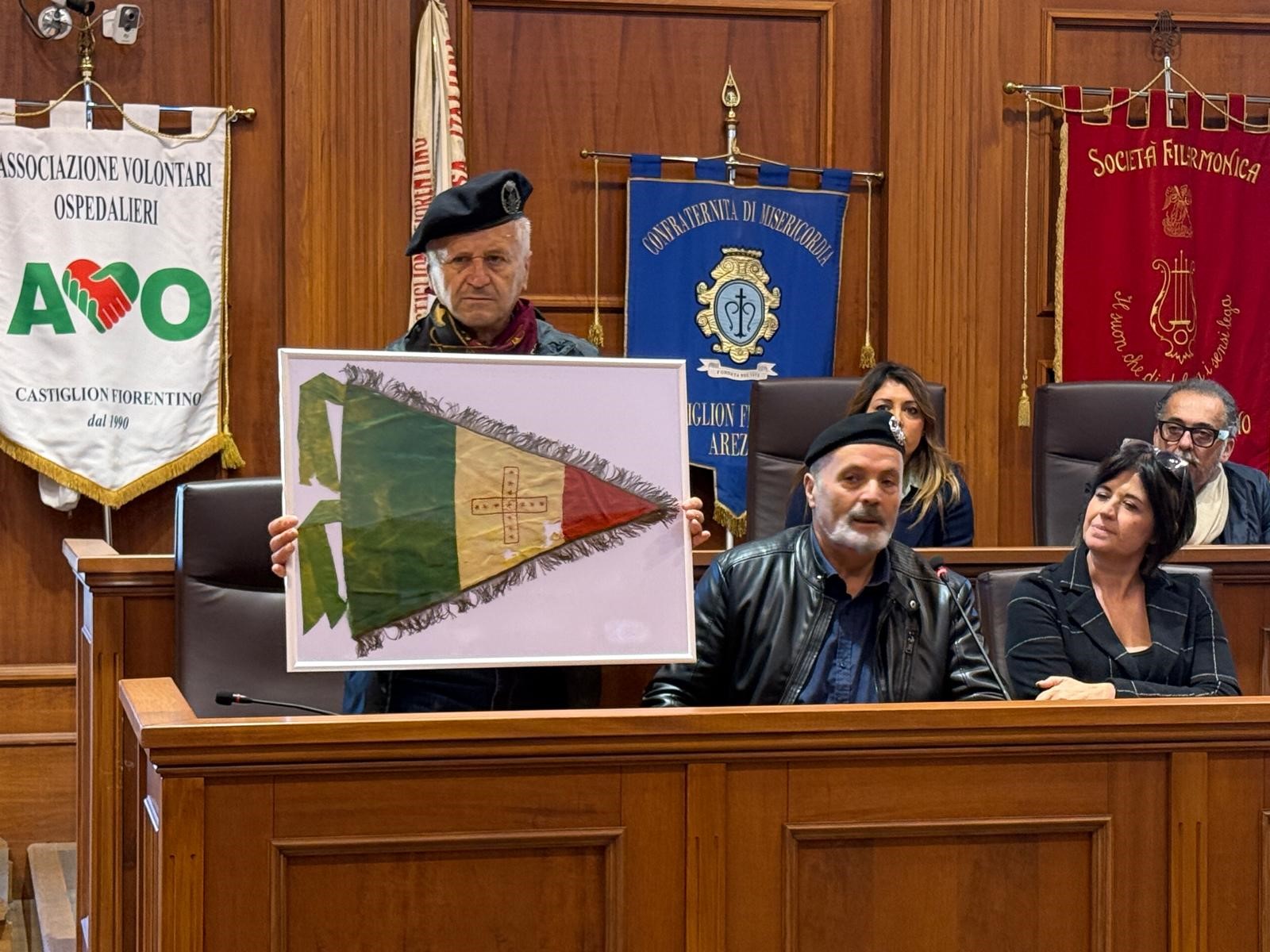 Al termine delle consuete celebrazioni, prima al Monumento dei Caduti ai Giardini di Piazza Matteotti e poi al Sacrario di Palazzo San Michele, alle quali hanno partecipato, tra gli altri, il Capitano dei Carabinieri, Roberto Pivotto, le Associazioni Combattentistiche , la Croce Rossa e la Misericordia, il Consiglio Comunale dei Ragazzi oltre ad una rappresentanza dell’Amministrazione Comunale ivi compreso il capogruppo di “Rinascimento Castiglionese”, la manifestazione si è spostata in sala San Michele dove ha preso la parola Gustavo Cavallini dell’associazione Artume che ha illustrato i due nuovi pezzi, un fazzoletto patriottico riguardante la guerra Italo-Turca e un gagliardetto simbolo della Guerra e proveniente dalla Russia, che arricchiscono la collezione di bandiere italiane risalenti alle varie guerre a cui ha partecipato l’Italia ed esposte nella terza cella del Corridoio delle Carceri a Palazzo Pretorio.