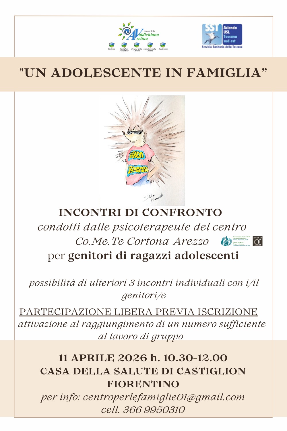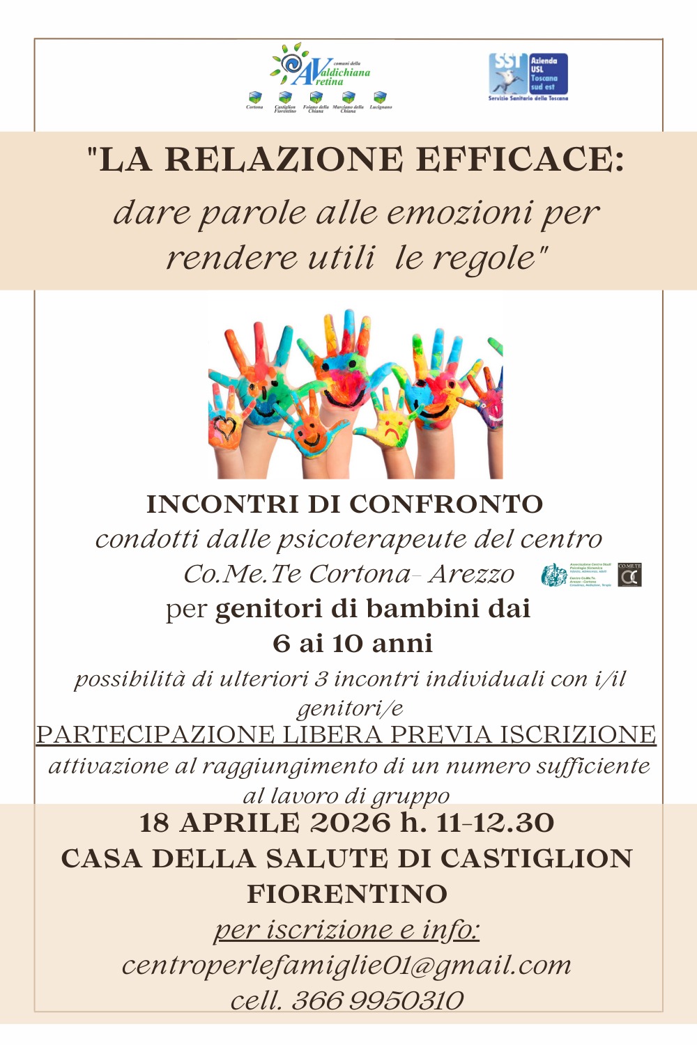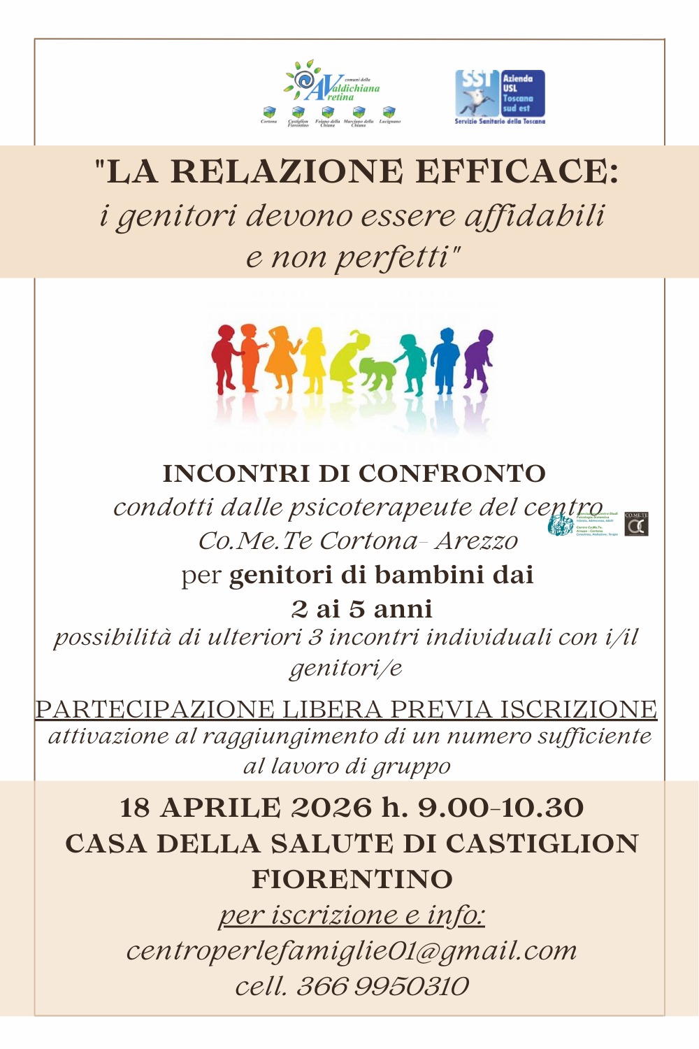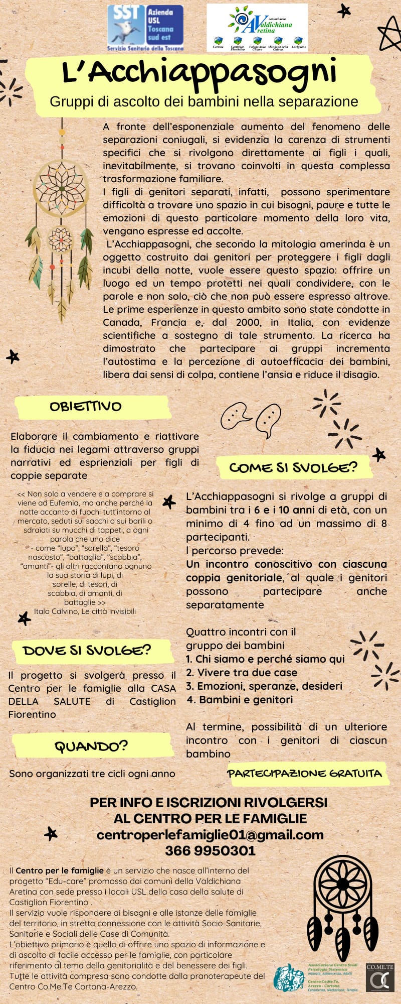 ll Centro per le Famiglie è un servizio nato nell'ambito del progetto "Educare", frutto della sinergia tra i Comuni della Zona Valdichiana Aretina (tra cui Cortona, Castiglion Fiorentino, Foiano della Chiana, Lucignano e Marciano della Chiana) e l'Azienda USL Toscana sud est. Operativo presso la Casa della Salute di Castiglion Fiorentino, il Centro si propone come un punto di riferimento accogliente e facilmente raggiungibile per rispondere alle necessità del territorio, offrendo ascolto e orientamento.